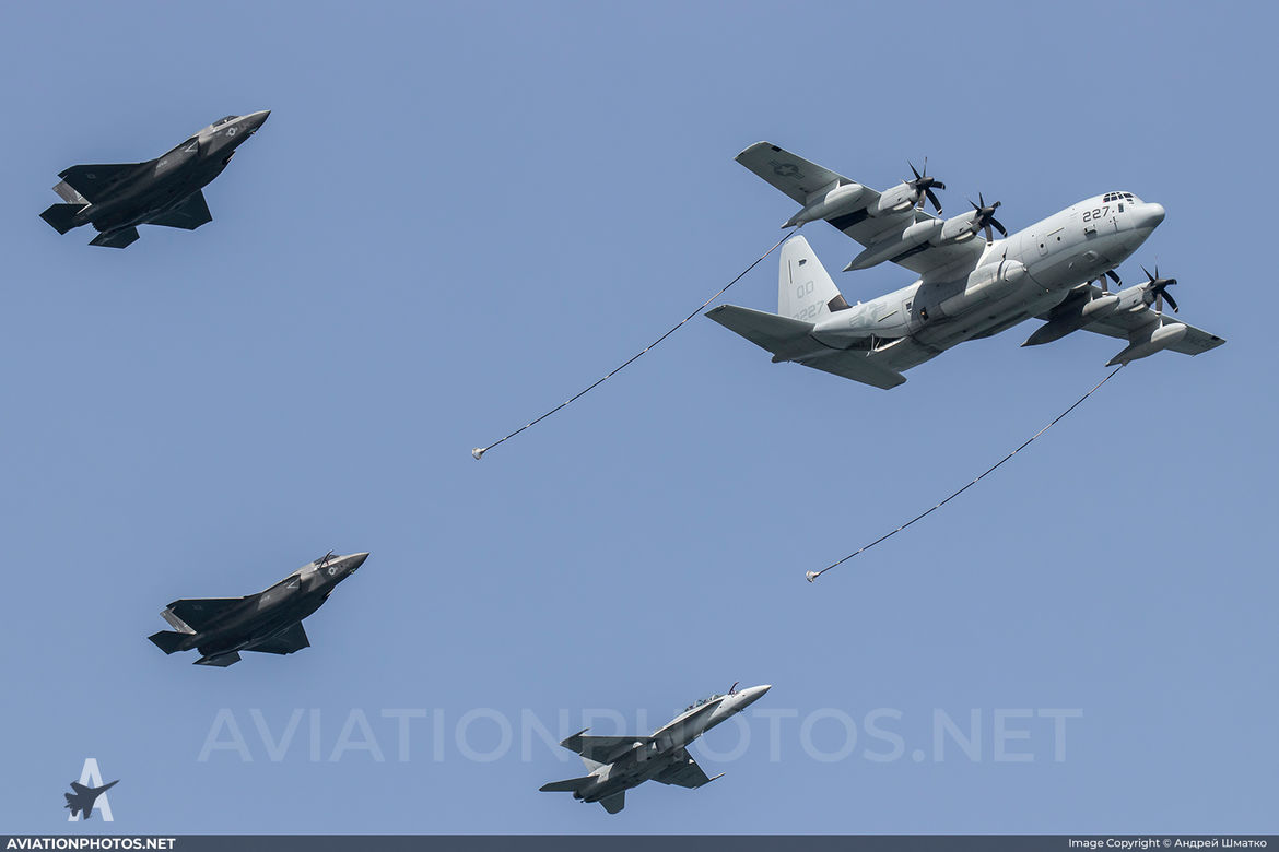 Комментарии автора: KC-130J, 2xF-35B & F/A-18D performing refueling exercise during Iwakuni friendship day 2018 rehearsal.